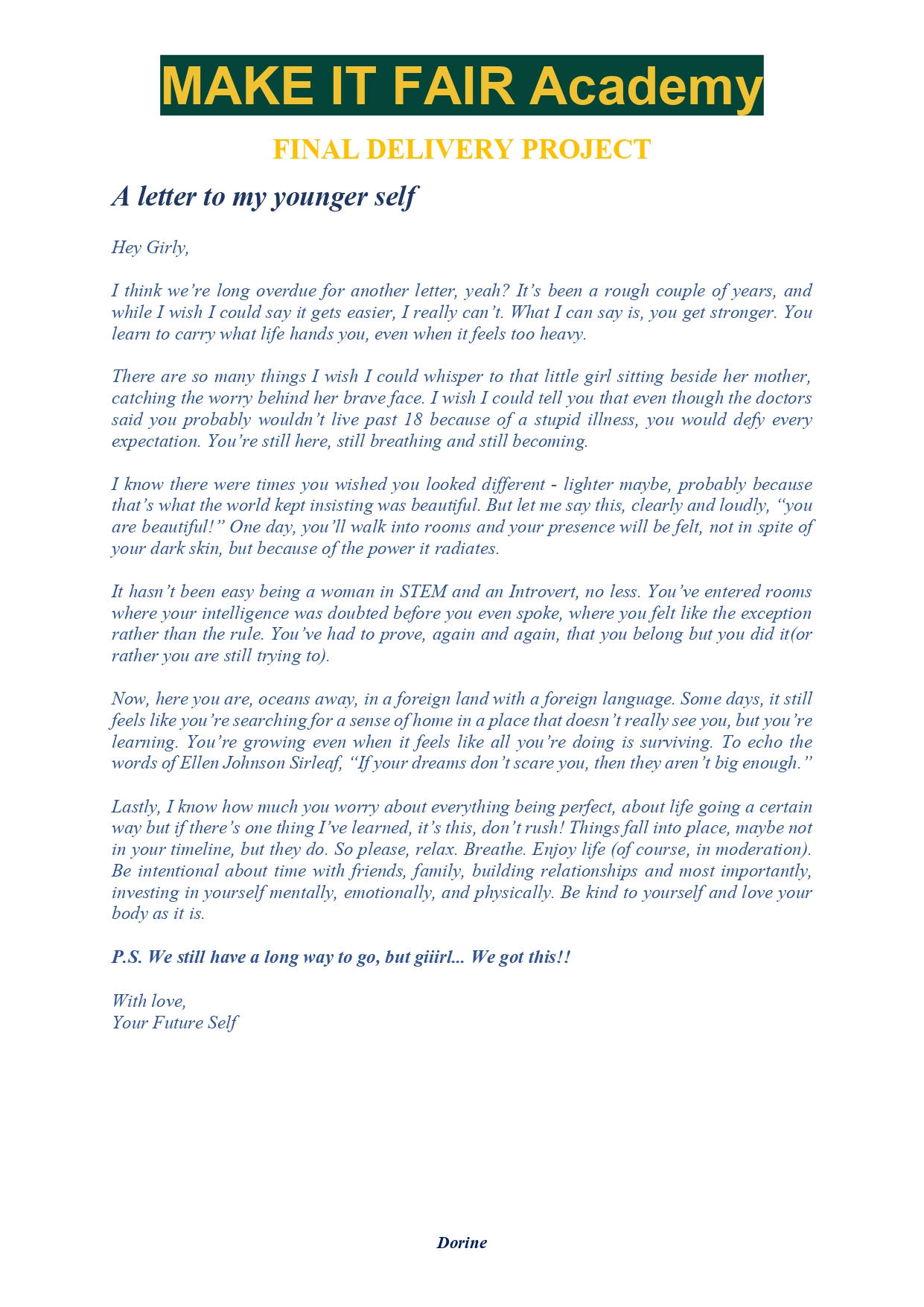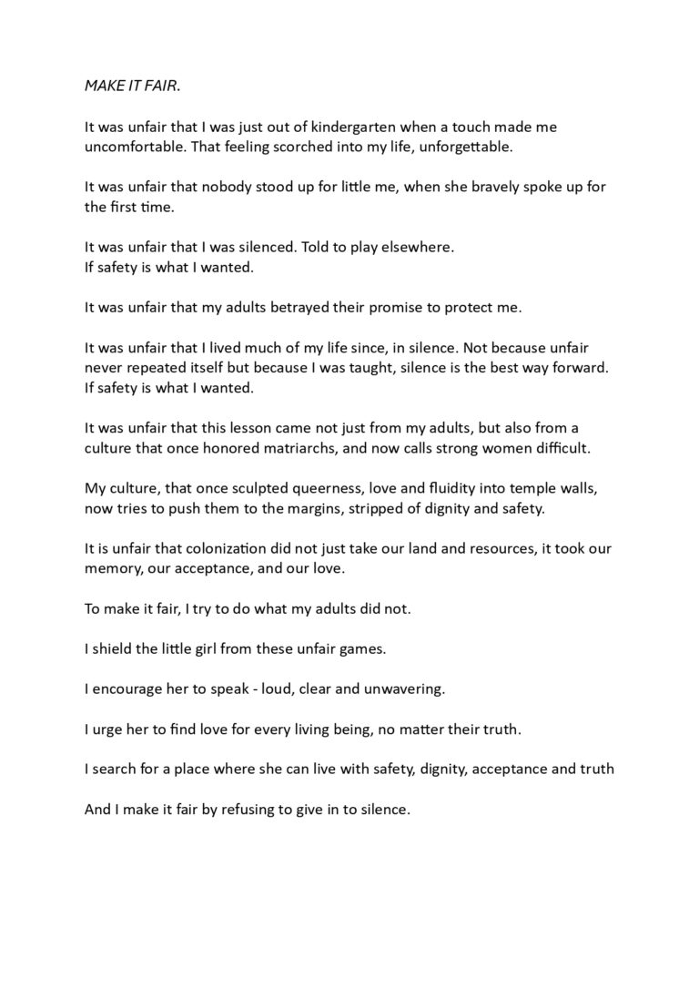 Here you will find a selection of creations by participants of the Make it Fair: Voices for Equality online Academy. These projects showcase a deep sense of self and reflection on the issues that were discussed during the Academy, they were presented with honesty and with a strong purpose. We hope you are able to see them as such.
